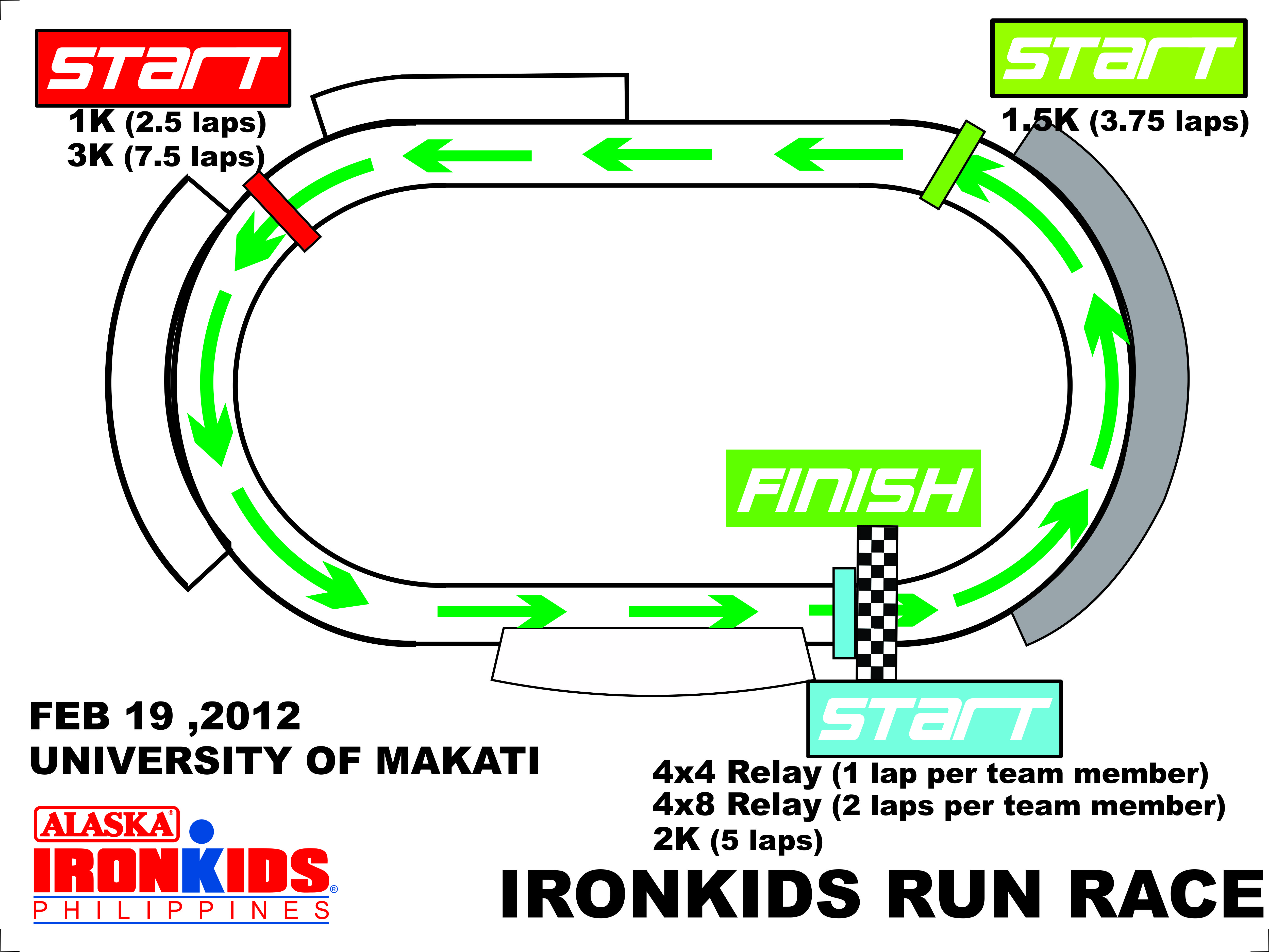Our first Alaska Ironkids Race for the year is just a few weeks away. The University of Makati offers us a great running track to hold our individual and newly-added run relay races on Feb 19, 2012. Listed below are the race distances, mechanics of the relay events, and race maps. Please make sure to register asap at